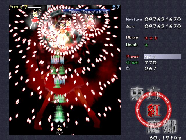 Zacznijmy jednak od początku. Czym w ogóle jest Touhou? Samo słowo oznacza po japońsku „orient”, jednak nie ma wielkiego związku z tytułem jakiegokolwiek dzieła ZUNa. Najprościej rzecz ujmując to seria shooterów 2D typu danmaku (czy też curtain shooterów). Cóż to w ogóle znaczy? Ogólnie mówiąc, gry z tej serii (z paroma wyjątkami) przypominają trochę Space Invadera – sterujemy postacią poruszającą się konsekwentnie po planszy (która wciąż przesuwa się naprzód, a gracz może decydować jedynie o wysuwaniu do przodu lub do tyłu swojego awatara), zabijając po drodze wrogów i sami próbując uniknąć ich pocisków. Mniej więcej w połowie każdego poziomu i na ich końcu walczymy z potężniejszymi od zwykłych przeciwników bossami, którzy mają również więcej żyć i specjalnych ataków. Pomnóżmy to jeszcze przez sześć takich części zwanych etapami (plus dodatkowy, znany jako poziom Ekstra), a otrzymamy ogólny obraz tej gry – to jest mniej więcej tyle, jeśli chodzi o podstawy rozgrywki. Cóż, są jeszcze takie niuanse jak scoring (kiedy, za co i ile dostajemy punkty), graze (omijanie pocisków za punkty) czy hitboxy (powiązane z grazem, są to punkty, w których dany obiekt – wróg, pocisk lub gracz – jest wrażliwy na zderzenie), ale nie jest to odpowiednie miejsce na objaśnianie ich. Mogę za to jeszcze wspomnieć szerzej o kartach zaklęć, które stanowią bardzo istotny element rozgrywki. Poza zwykłymi atakami bossów i naszych własnych, do dyspozycji są też karty zaklęć – używane przez naszych potężnych przeciwników lub przez nas w formie tzw. „bomb”. O ile jednak bossowie mają dużo kart i trwają one długo, o tyle bomby przeznaczone dla gracza mają krótki okres działania i są takie same przez całą grę (chociaż możemy wybrać na jej początku, którym czarem chcemy się bawić – do wyboru są po dwa na każdą postać). Każde jednak zaklęcie – czy to nasze, czy bossa – ma kilka wspólnych efektów. Przede wszystkim dają używającej go postaci chwilową niewrażliwość na ataki przeciwnika, ponadto czyszczą całą planszę z obecnych na niej pocisków i zmieniają je w punkty (które – oczywiście – otrzymuje gracz). Są też, rzecz jasna, bardzo potężne: w wypadku czarów bossów tworzą nowe patterny pocisków, a dla używającego ich gracza to po prostu szybki sposób na znaczne skrócenie paska życia przeciwnika i oczyszczenie sobie drogi ze stojących nam na drodze przeszkód.